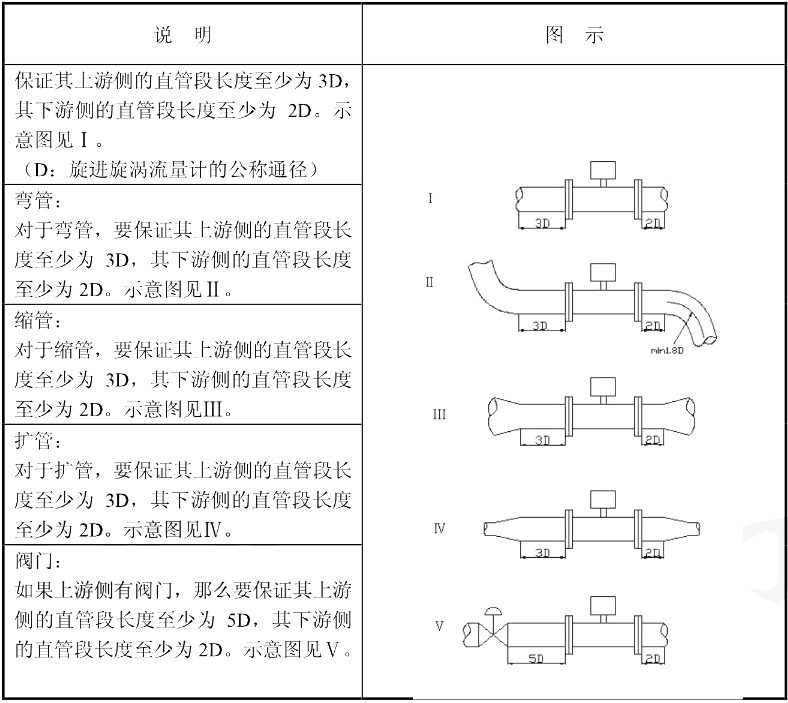 根据旋进旋涡流量计的工作原理和流量计对上、下游直管段要求,对不同的上游阻力件,建议采用正确的前后直管段长度,且保持直管段内壁光滑平直。那下边小编就用表格的方式为大家介绍前后直管段长度的安装要求。